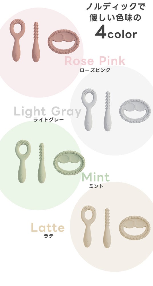 3種の異なる形が、赤ちゃんの舌や口周りの筋肉を満遍なく鍛えるのに計算されたデザインになっています。