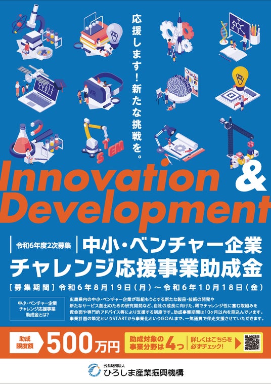 公益財団法人ひろしま産業振興機構では、広島県内の中小・ベンチャー企業が新たな製品・技術の開発や新たなサービス創出に取り組むための研究開発など、自社の成長に向けた、稀でチャレンジ性に富む取組みを資金面や専門的アドバイス等により支援いたします。