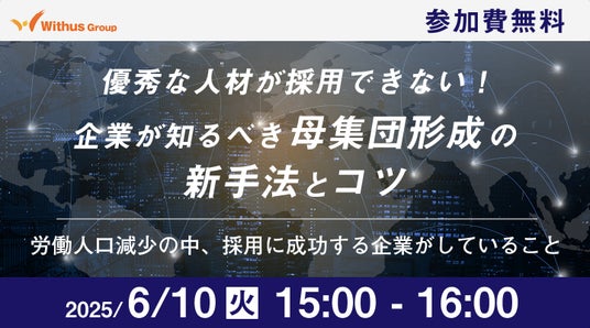 株式会社ウィザス(本社:大阪府大阪市、代表取締役社長:生駒 富男)キャリア支援事業カンパニーは、6 月10 日、少子高齢化が加速する日本において、労働人口の減少が深刻化するなか、人材の需給と供給のギャップなど現状の採用課題を解説し、その解決策を提案する『企業が知るべき母集団形成の新手法とコツ』をテーマにセミナーを開催いたします。