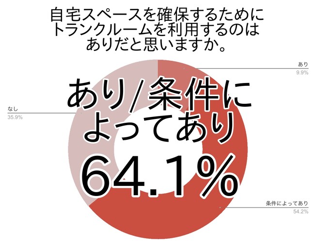 最も多かった「条件によってあり(関東54.2%・全国52.8%)」と「あり(関東9.9%・全国11.0%)」を合わせて、自宅スペースを確保するためにトランクルームを利用する選択肢を評価している方は約6割(関東64.1%・全国63.8%)でした。