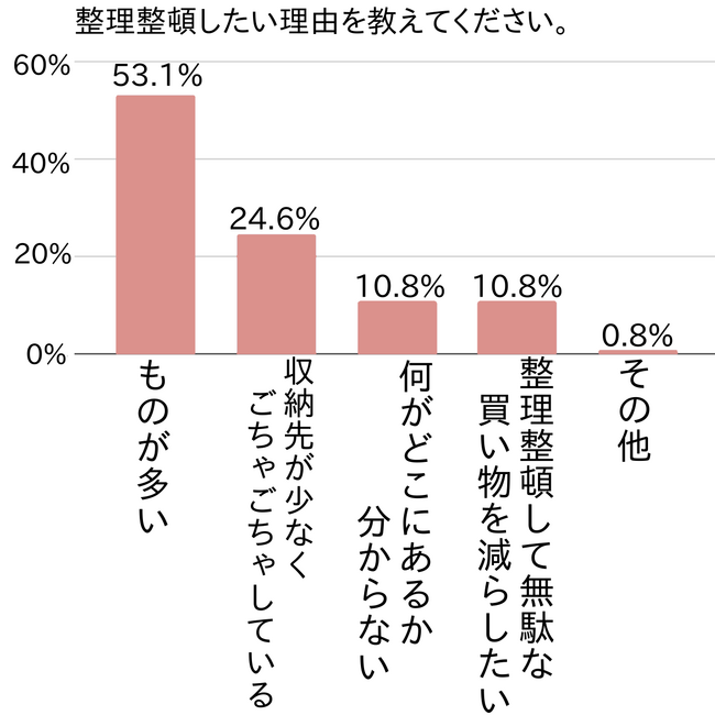 整理整頓したくてもなかなかできていない部屋・場所がある方は多く、中でも収納スペースや普段長く過ごす寝室・リビングが気になる方が多いことがわかりました。では、整理整頓したいと感じる理由は何でしょうか。アンケートで尋ねてみました。