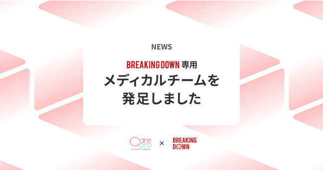 総合格闘技イベントを展開するBreakingDown株式会社(本社:東京都港区、代表取締役:朝倉未来) は、革新的なヘルスケアサービスの提供をビジョンに掲げるケアプロ株式会社(本社:東京都中野区、代表取締役:川添 高志) と提携し、BreakingDownの専用メディカルチームを整備したことをお知らせいたします。なお、メディカルチームは2023年8月26日(土)に開催される「喧嘩道 presents BreakingDown9」より活動をスタートします。