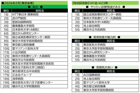 【東京会場(2月)】の総合トップはNTT東日本 関東病院。ランキング上位は、前年8月実施の東京会場同様に、全国的に知名度の高い病院が上位にランクインする結果となった。