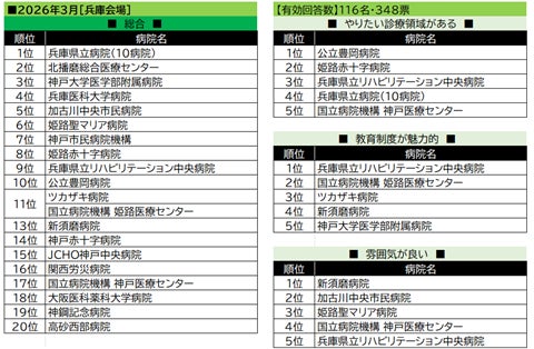 【兵庫会場】は2会場合算の結果としてリリース。全体としては国公立病院系が多くランクイン。総合トップは兵庫県立病院(10病院)。「教育制度が魅力的」でトップの兵庫県立リハビリテーション中央病院は、「やりたい診療領域」で3位、「雰囲気が良い」でも5位に登場。「雰囲気が良い」の首位は民間の新須磨病院が獲得した。