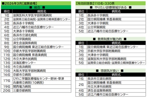 【滋賀会場】でのランキング上位には、国公立・公的病院が多くランクインした。総合トップの滋賀医科大学医学部附属病院は、大学病院が多くランクインした「教育制度が魅力的」ジャンルでも4位となっている。