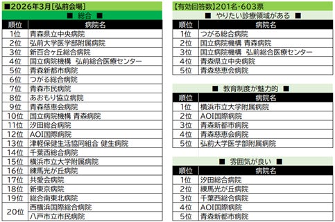 【弘前会場】のトップは青森県立中央病院。総合ランキングでは青森県の病院が名を連ねるなか、「教育制度が魅力的」、「雰囲気が良い」のジャンルでは、神奈川県の病院が複数見受けられた。