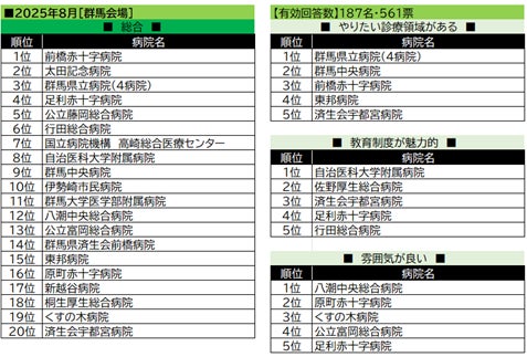 【群馬会場】で総合1位の前橋赤十字病院は、「やりたい診療領域」でも3位を獲得。群馬県内の病院が上位にランクインするなかで、「雰囲気が良い」ジャンルでは、茨城会場に続き、県外の八潮中央総合病院が首位を獲得した。