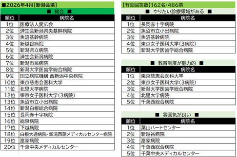 【新潟会場】でのランキングは県内の病院がほとんどであったが、東京への就職が多いエリアということもあり、各ジャンルにおいて、関東地方の病院のランク入りも目立った。