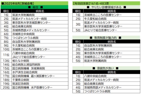 【茨城会場】では筑波大学附属病院が総合の首位を獲得。続く2位の筑波メディカルセンター病院、3位の東京医科大学茨城医療センターは、他ジャンルにもランクインしている。茨城県内の病院がほとんどを占めるなか、埼玉県の八潮中央総合病院が「雰囲気が良い」で首位を獲得した。