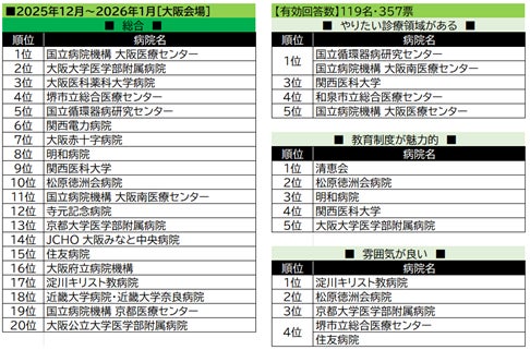 【大阪会場】は3会場合算の結果として算出。「総合」「やりたい診療領域」ともに、国公立のランキング上位が目立った。「教育制度」と「雰囲気が良い」ランキングでは、民間病院が上位を獲得。