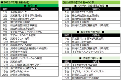 【浜松会場】総合1位は国公立の浜松医療センターが獲得。2位の浜松医科大学医学部附属病院は、「教育制度」ジャンルでは1位を獲得。浜松会場でランクインした病院は、ほとんどが県内の病院という結果となった。