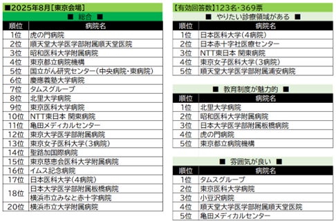 【東京会場(8月)】の総合1位は虎の門病院。続く2位・3位も大学病院がランクイン。全体として全国的に知名度の高い病院が上位を獲得した。「雰囲気が良い」1位となった、民間病院のタムスグループは、総合でも7位で健闘。