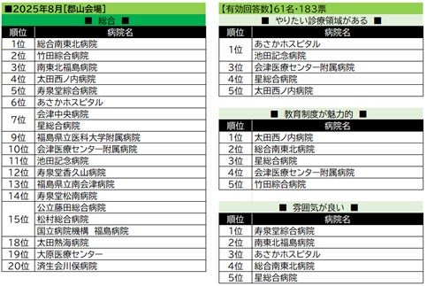 【郡山会場】では県内近隣の民間病院が、多くのジャンルで上位を占めた。総合トップは総合南東北病院で、他のジャンルにおいてもベスト5入りを果たしている。「教育制度が魅力的」で首位の太田西ノ内病院、「雰囲気が良い」で首位の寿泉堂綜合病院ともに、総合でもベスト5入りしている。