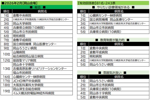 【岡山会場】では「総合」と「教育制度」の2ジャンルで倉敷中央病院が首位となり、「雰囲気が良い」でも、ベスト5入りを果たした。全体としてランキング上位を占めたのは、岡山県内の病院。「やりたい診療領域」では、県外からの患者も多い、心臓病センター榊原病院が首位を獲得した。