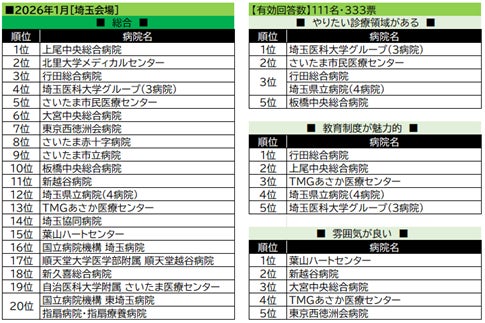 【埼玉会場】の総合1位は上尾中央病院。「教育制度が魅力的」ジャンルでも2位を獲得。総合3位の行田総合病院は「教育制度」で1位を獲得している。「やりたい診療領域」で1位の埼玉医科大学グループは、総合でも4位にランクインしている。「雰囲気が良い」で1位の葉山ハートセンターは神奈川県の病院でありながら首位を獲得している。