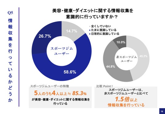 スポーツジムユーザーは、美容・健康・ダイエットに関する情報収集や行動において、非常に積極的であることが調査から分かりました。