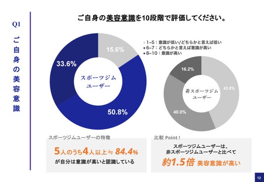調査によると、スポーツジムユーザーの84.4%が「自分は美容意識が高い」と回答しており、非ユーザーの約1.5倍の水準です。