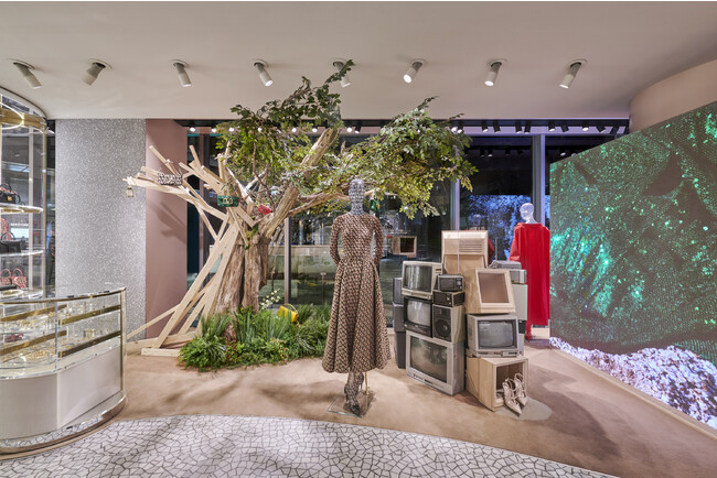 レベッカ・コービン・マレー氏のコンセプトは、イエローの3Dフラワーがあしらわれたブラックのランウェイルックからインスピレーションを得ています。ロンドンのウィンドウでは、オールブラックのルックの背景としてイエローのフラワーが映し出され、ルックのシルエットと生き生きと咲く花がコントラストになっています。このウィンドウでは太陽やバターカップ、花の中心部の色である黄色が自然のアンボクシングを表現し、複雑なエネルギーに満ちたサイケデリックな世界への架け橋になります。