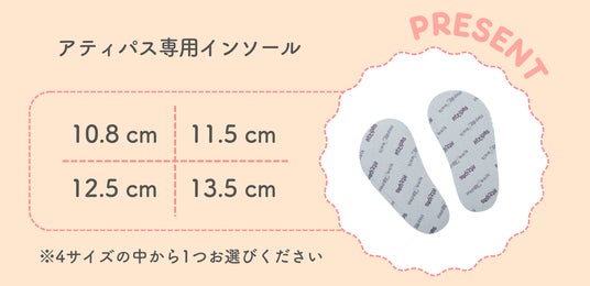 キャンペーン期間中アティパス公式サイトにてアイテムと「アティパス専用インソール」を一緒にカートに追加いただくと、3,000円ご購入ごとにお好きなサイズのアティパス専用インソールが1点分無料となります。※6,000円以上で2点プレゼント