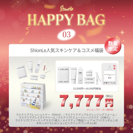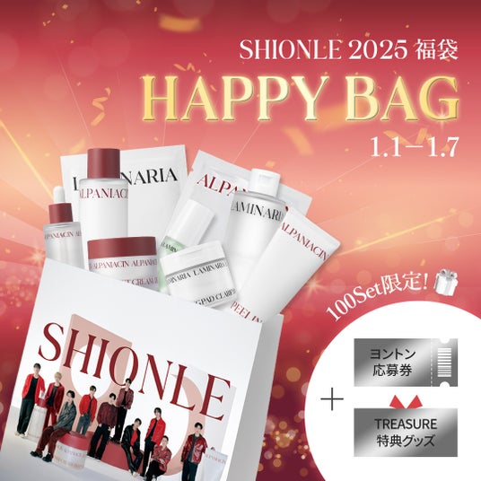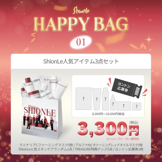 数量限定のHAPPYBAG(福袋)がQoo10にて元旦より発売! 日本の元旦の風物詩と言えば【福袋】といっても過言でないほどあらゆるショップからも展開。2025年元旦よりShionLe公式Qoo10ショップでも数量限定で販売いたします。ここでしか買えない【超豪華!超お買い得!】な商品を詰め込んだ、まさに【HAPPYBAG】ではTREASUREファンも、韓国スキンケアLOVERも楽しめる内容となっております。数量限定の商品となるため、2025年の元旦はQoo10を要CHECK!自分自身へのご褒美やお友だち、家族へのプレゼントとしてもオススメです。