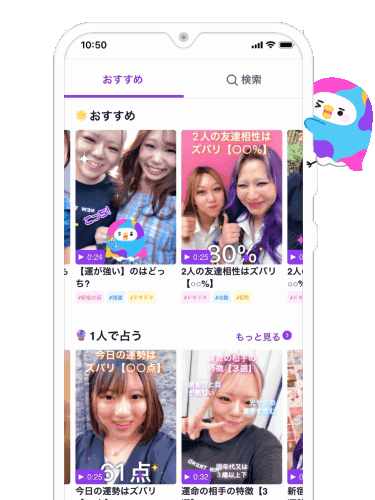 本アプリは、生年月日を入れるだけで、ひとりで楽しむ「今日の運勢」や、複数人で利用する「相性占い」など多数のメニューから希望の占いを選択し、同時に動画を撮影することで、TikTokをはじめとするSNSのショート動画で占い結果をシェアできるなど、オンラインでも楽しむことが可能です。