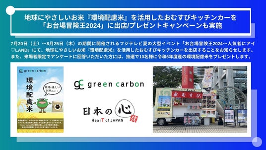 Green Carbon株式会社(代表取締役:大北潤、以下Green Carbon(読み;グリーンカーボン))はこの度、おむすびキッチンカー「日本の心」を運営する株式会社民虎(執行役員CEO:仁井田 大慈、以下民虎)と連携し、7月20日(土)~8月25日(木)の期間に開催されるフジテレビ夏の大型イベント「お台場冒険王2024~人気者にアイ(ハート)LAND」にて、地球にやさしいお米『環境配慮米』を活用したおむすびキッチンカーを出店することをお知らせします。また、来場者限定でアンケートに回答いただいた方には、抽選で10名様に令和6年度産の環境配慮米をプレゼントします。