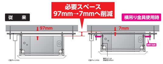 - 「横吊り金具」(別売)により、C型チャンネル(※10)などの鋼材を用いて室内ユニット「4方向天井カセット形<i-スクエアタイプ>」を吊る場合の天井裏の必要スペースを従来の97mm(※11)から7mmに削減でき、室内ユニット入替時の設置自由度が向上し、施工性を改善(※12)