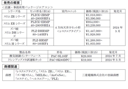 三菱電機株式会社は、店舗・事務所用パッケージエアコン「スリムZRシリーズ」、「スリムERシリーズ」、「ズバ暖スリムDHシリーズ」、「ズバ暖スリムHシリーズ」の新製品を2024年5月より順次発売します。空調機の性能改善と当社製換気・送風機器との連携運転による省エネ性能向上でカーボンニュートラル実現に貢献します。
