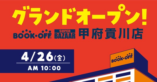 ブックオフグループホールディングス株式会社(本社:神奈川県相模原市、代表取締役社長:堀内康隆)の子会社で、リユースショップ「BOOKOFF」等を運営するブックオフコーポレーション株式会社(神奈川県相模原市、代表取締役社長:堀内康隆、以下、ブックオフ)は、2024年4月26日(金)に約1,000坪規模では、山梨県初出店となる「BOOKOFF SUPER BAZAAR 甲府貢川店」と、「BOOKOFF SUPER BAZAAR エディオン大津店」をオープンいたします。