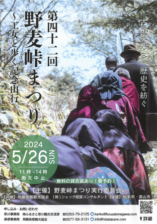 令和6年5月26日(日)、第42回野麦峠まつりが野麦峠を境に接する松本市奈川、高山市高根両地区の観光協会の共催で開催されます。