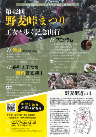 映画「あゝ野麦峠」の舞台で知られる野麦峠で、令和6年5月26日(日)「野麦峠まつり」が開催されます。多くの糸引き工女たちが往来した当時を偲んで「旧野麦街道糸引き工女行列」や、郷土芸能の披露、地元特産品などのバザーが行われます。