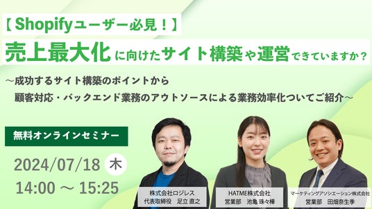 ECサイトの運営代行サービスを提供しているマーケティングアソシエーション株式会社(本社:東京都台東区 代表取締役:中園広和、以下当社)は、2024年7月18日(木)に、ウェブセミナー「【Shopifyユーザー必見!】売上最大化に向けたサイト構築や運営できていますか?~成功するサイト構築のポイントから顧客対応・バックエンド業務のアウトソースによる業務効率化ついてご紹介~」を、株式会社ロジレス、HATME株式会社と共催いたします。