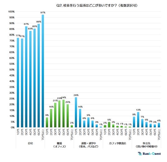 - 「職場(オフィス)」(2%)、「通勤中」(1%)などはほとんどなく、「外出先」(4%)もわずかにとどまるため、外での検索習慣が非常に少ない年代といえます。