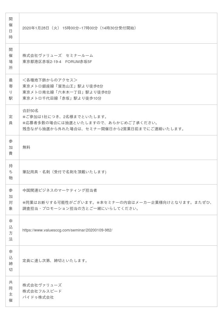 インターネット行動ログ分析によるマーケティング調査・コンサルティングサービスを提供する株式会社ヴァリューズ(本社:東京都港区、代表取締役社長:辻本 秀幸、以下「ヴァリューズ」)は、インターネットマーケティング支援をおこなう株式会社フルスピード(所在地:東京都渋谷区、代表取締役社長:友松 功一)と、中国最大の検索エンジン「百度」の日本法人であるバイドゥ株式会社(本社:東京都港区、代表取締役社長:Charles Zhang)と共催で、中国の最新デジタル事情やインバウンド動向からマーケティング設計手法まで解説する中国マーケティングセミナーを、2020年1月28日(火)に東京・赤坂で無料開催いたします。