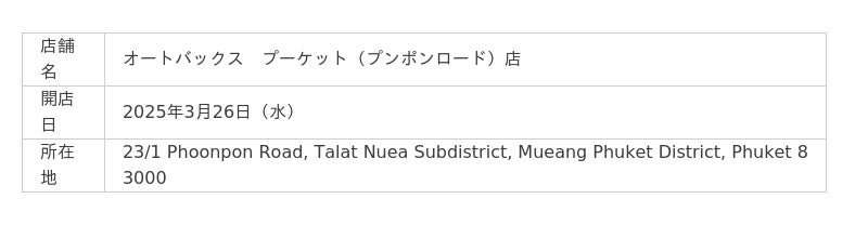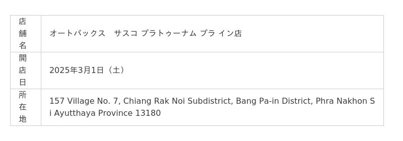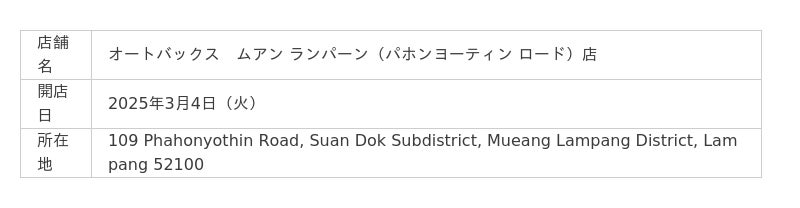 株式会社オートバックスセブン(代表取締役 社長:堀井勇吾)とタイ国内におけるエリアフランチャイズ契約を締結しているSIAM AUTOBACS CO., LTD.(代表取締役:Rangsun Puangprang)は、2025年3月に以下3店舗を新規オープンいたしました。