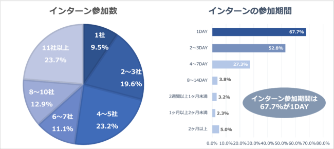 インターンに参加した期間については「1DAY」が67.7%と最多で、次いで「2~3DAY」が52.8%、「4~7DAY」が27.3%で上位3つの回答結果でした。1ヶ月以上インターンに参加したのは7.3%の回答結果になりました。