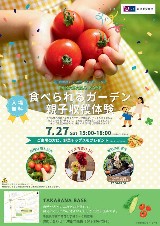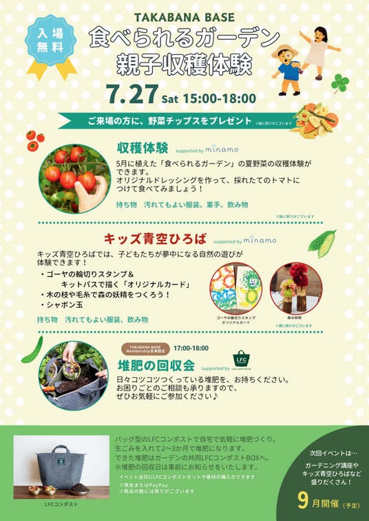 5月に植え付けた「食べられるガーデン」の夏野菜の収穫体験。オリジナルドレッシングを作り、収穫したトマトに味付け。キッズ青空ひろばで楽しい自然の遊びを体験