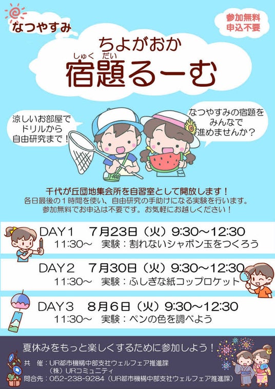 この夏休み、UR都市機構は全国各地で、子どもの居場所づくりにつながるイベントを開催します。遊んだり勉強したり、時には自由研究のテーマを考えたりして、みんなでURに集まって、思い出をつくりませんか。