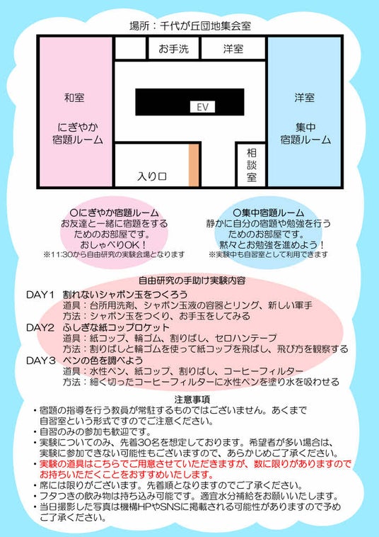 団地集会所を自習室として開放し、自由研究の手助けになる実験も開催