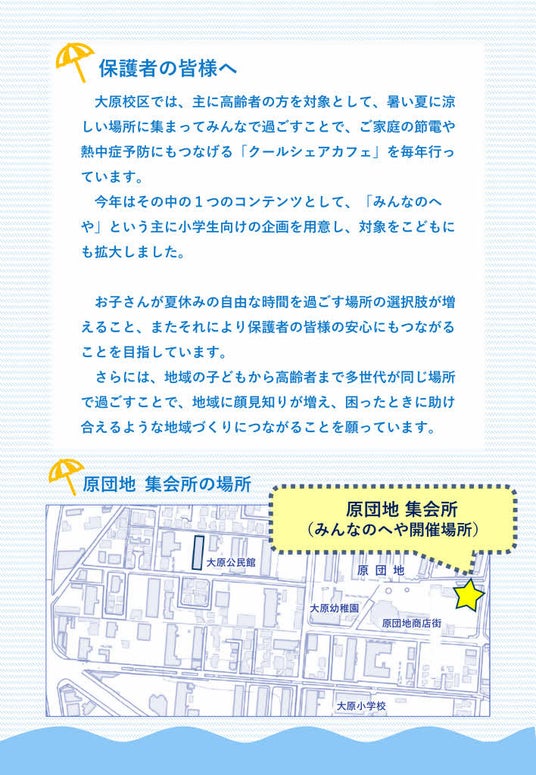 毎夏、原団地の集会所で行われている、節電や熱中症予防を目的とした大原校区社会福祉協議会が主催する「クールシェアカフェ」に、「みんなのへや」企画を加え、室内遊びや子どもの学習支援を実施