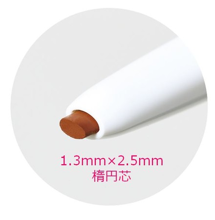 “1.3mm×2.5mm”の「楕円芯」を採用し、クッキリ細いラインもふんわり太めのラインも自由自在。