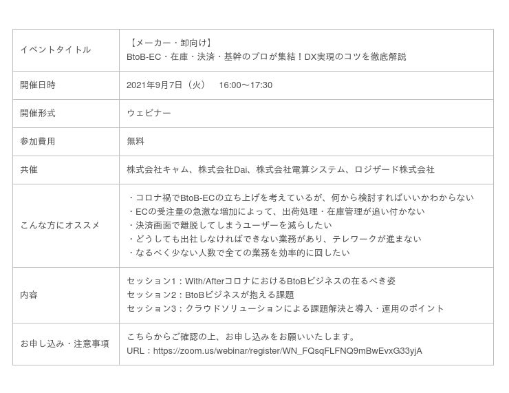 クラウド型在庫管理システムのリーディングカンパニーであるロジザード株式会社(東京都中央区、代表取締役社長:金澤 茂則、以下ロジザード)は、2021年9月7日(火)に4社共催ウェビナー『【メーカー・卸向け】BtoB-EC・在庫・決済・基幹のプロが集結!DX実現のコツを徹底解説』を開催いたしますので、お知らせいたします。