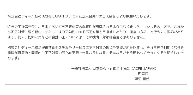 この度、ディーバはお客様のグループ経営管理をご支援する一環で、ACFEの理念に賛同し、プレミアム法人会員として入会する運びとなりました。今後もディーバは公認不正検査士協会との協業を通して、グループ経営における不正防止にお役に立てるソリューションを提供して参ります。