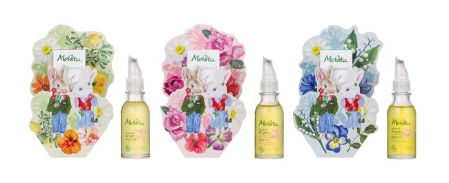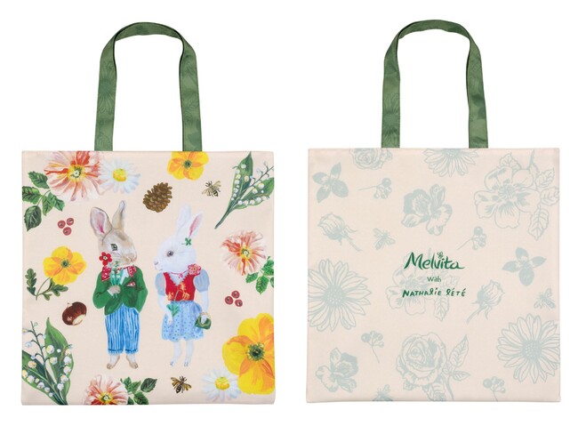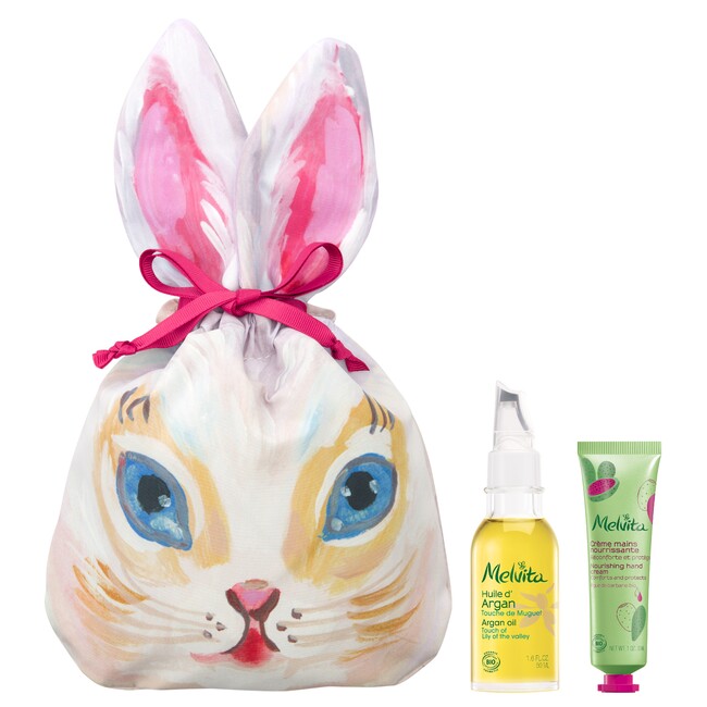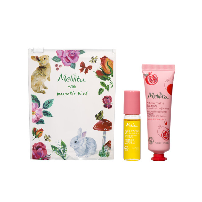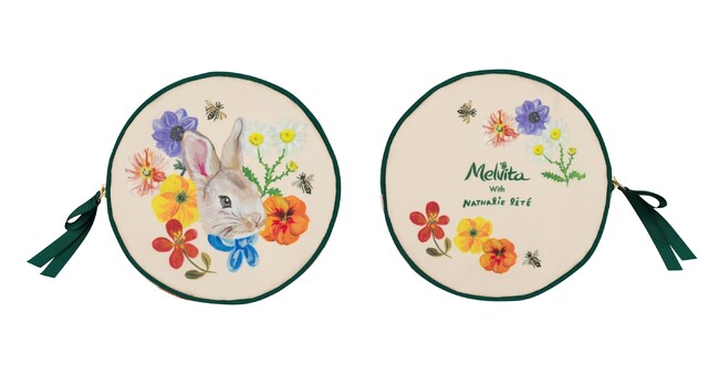 ナタリー・レテが描き下ろしたラパンを大胆にあしらった巾着ポーチに、メルヴィータのベストセラー「ビオオイル アルガンオイル」の中でも特別なシーズンにしか手に入らない香り「リリーオブザバレー」とビーガン処方のハンドクリームをセット。