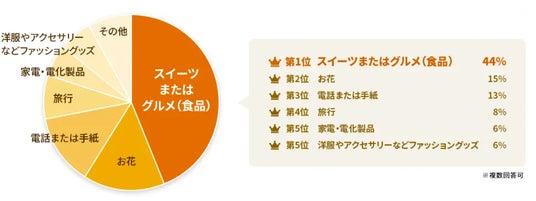 敬老の日に今までもらって嬉しかったプレゼント、今年もらいたいプレゼントともに「スイーツまたはグルメ」と「お花」が1位、2位という結果でした。