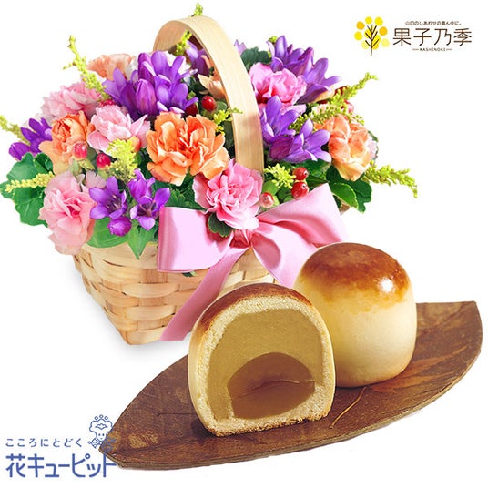 リンドウのウッドバスケットと【果子乃季】栗ほまれ 6個入ピンクのリボンを添えた可愛らしい「リンドウのウッドバスケット」と、大粒の和栗入り栗饅頭「栗ほまれ」とのセットです。ほくっと心地よい食感がたまらない国産の高級和栗を、贅沢に丸ごと一粒包みました。栗あんの昔懐かしい味わいを、敬老の日におじいちゃん・おばあちゃんへお届けいたします。