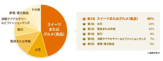 今年特にもらいたいプレゼントも、今までもらって嬉しかったプレゼントと同様に「スイーツまたはグルメ」が最も多く46%、「お花」「電話または手紙」が同率2位で、その次に「旅行」という結果となりました。