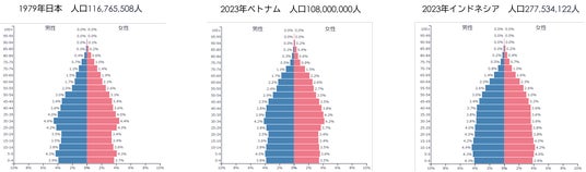 1979年の日本、2023年のベトナム、インドネシアの人口ピラミッド