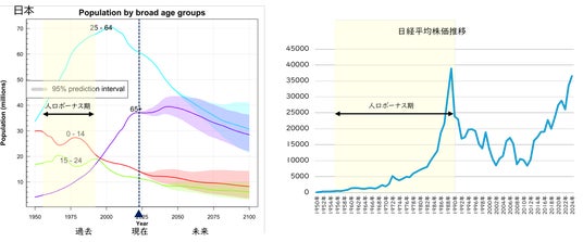 日本の年齢層別人口推移(左)と日経平均株価推移(右)