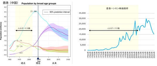 香港(中国)の年齢層別人口推移(左)と香港ハンセン株価推移(右)